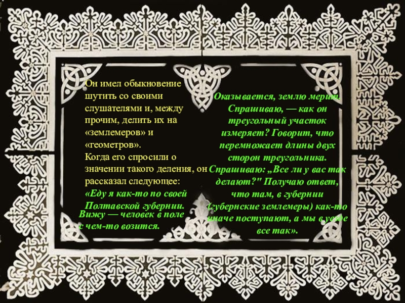 Оказывается, землю мерит. Спрашиваю, — как он треугольный участок измеряет? Говорит, что перемножает длины двух сторон треугольника. Спрашиваю: „Все ли у вас так делают?" Получаю ответ, что там, в губернии (губернские землемеры) как-то иначе поступают, а мы в уезде все так».