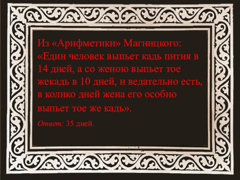 Слайд 65Из «Арифметики» Магницкого: «Един человек выпьет кадь пития в 14 дней,