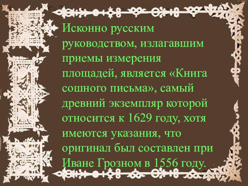 Исконно русским руководством, излагавшим приемы измерения площадей, является «Книга сошного письма»,