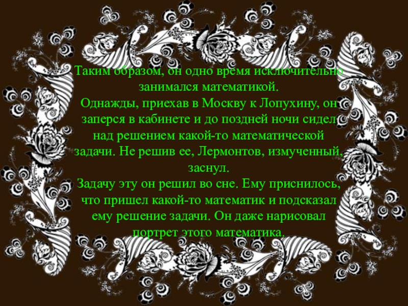 к Лопухину, он заперся в кабинете и до поздней ночи сидел над решением какой-то математической задачи. Не решив ее, Лермонтов, измученный, заснул.