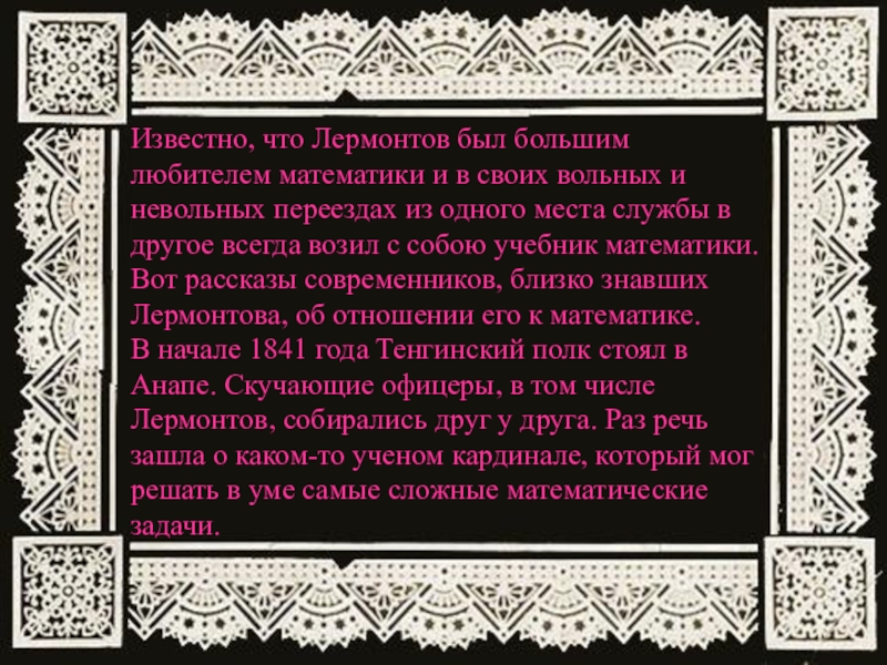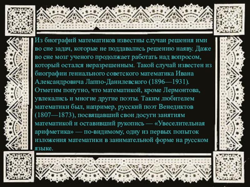 не поддавались решению наяву. Даже во сне мозг ученого продолжает работать над вопросом, который остался неразрешенным. Такой случай известен из биографии гениального советского математика Ивана Александровича Лаппо-Данилевского (1896—1931). Отметим попутно, что математикой, кроме Лермонтова, увлекались и многие другие поэты. Таким любителем математики был, например, русский поэт Венедиктов (1807—1873), посвящавший свои досуги занятиям математикой и оставивший рукопись — «Увеселительная арифметика» — по-видимому, одну из первых попыток изложения математики в занимательной форме на русском языке.