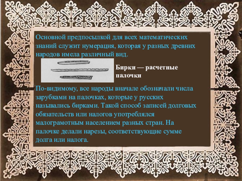 По-видимому, все народы вначале обозначали числа зарубками на палочках, которые у русских назывались бирками. Такой способ записей долговых обязательств или налогов употреблялся малограмотным населением разных стран. На палочке делали нарезы, соответствующие сумме долга или налога.