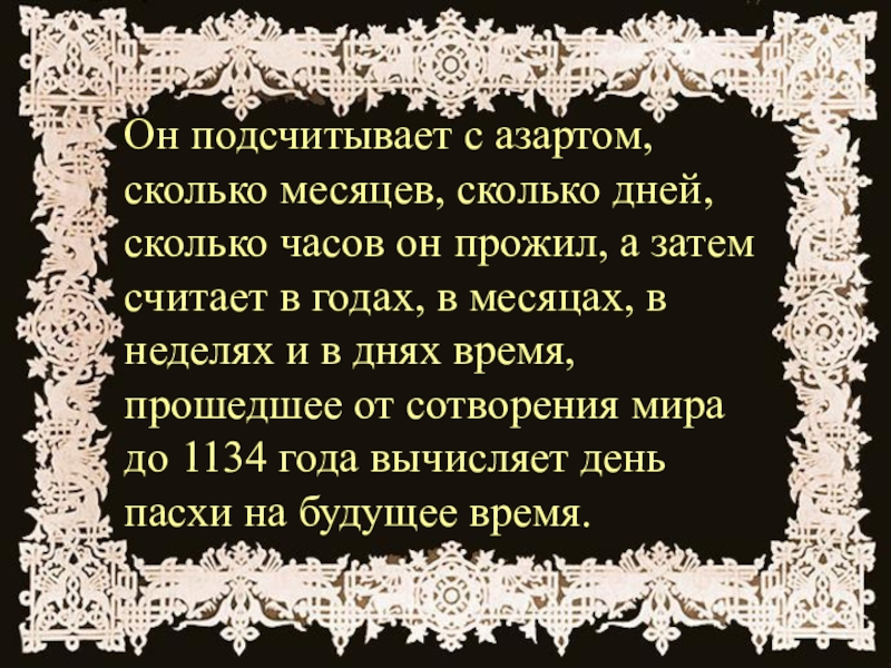 прожил, а затем считает в годах, в месяцах, в неделях и в днях время, прошедшее от сотворения мира до 1134 года вычисляет день пасхи на будущее время.