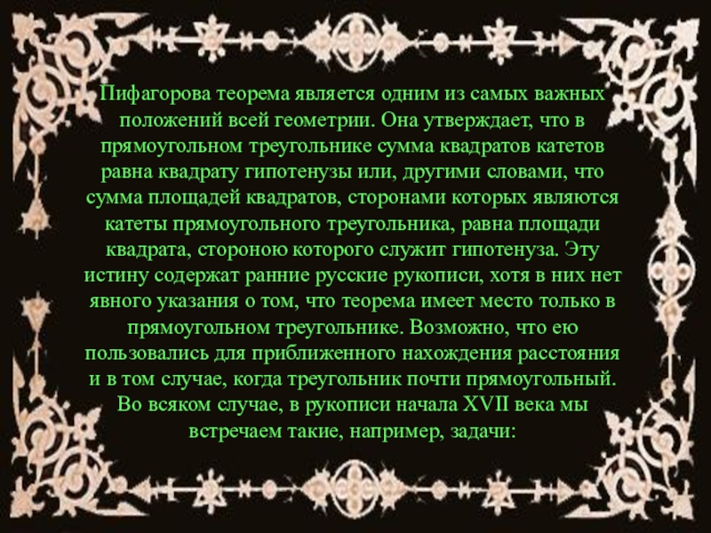 утверждает, что в прямоугольном треугольнике сумма квадратов катетов равна квадрату гипотенузы или, другими словами, что сумма площадей квадратов, сторонами которых являются катеты прямоугольного треугольника, равна площади квадрата, стороною которого служит гипотенуза. Эту истину содержат ранние русские рукописи, хотя в них нет явного указания о том, что теорема имеет место только в прямоугольном треугольнике. Возможно, что ею пользовались для приближенного нахождения расстояния и в том случае, когда треугольник почти прямоугольный. Во всяком случае, в рукописи начала XVII века мы встречаем такие, например, задачи: