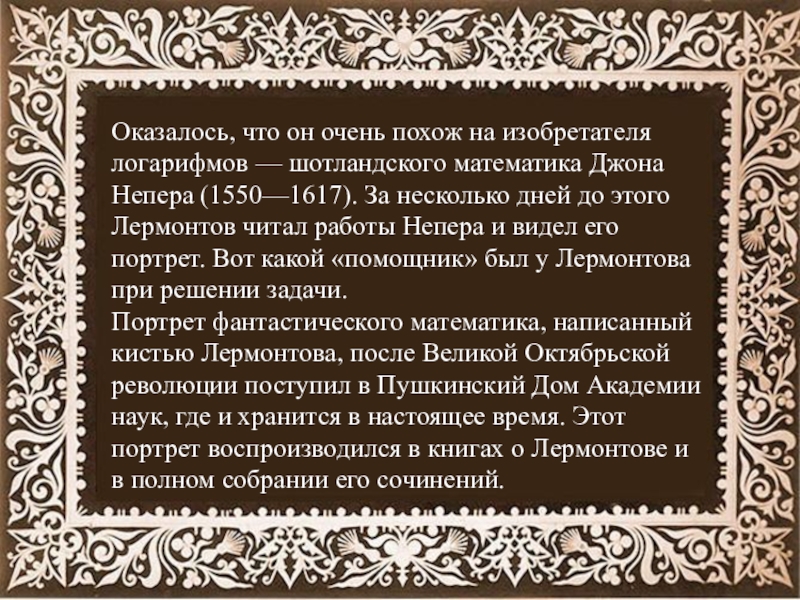 Джона Непера (1550—1617). За несколько дней до этого Лермонтов читал работы Непера и видел его портрет. Вот какой «помощник» был у Лермонтова при решении задачи.