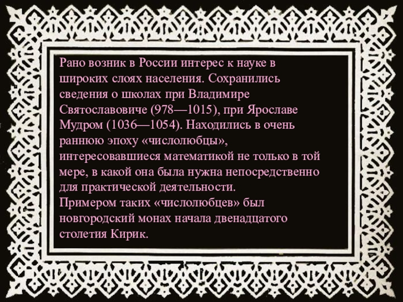 Сохранились сведения о школах при Владимире Святославовиче (978—1015), при Ярославе Мудром (1036—1054). Находились в очень раннюю эпоху «числолюбцы», интересовавшиеся математикой не только в той мере, в какой она была нужна непосредственно для практической деятельности.