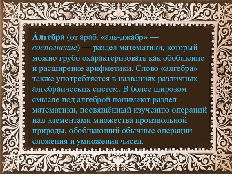 А́лгебра (от араб. «аль-джабр» — восполнение) — раздел математики, который можно грубо охарактеризовать