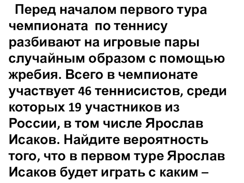 пары случайным образом с помощью жребия. Всего в чемпионате участвует 46 теннисистов, среди которых 19 участников из России, в том числе Ярослав Исаков. Найдите вероятность того, что в первом туре Ярослав Исаков будет играть с каким – либо теннисистом из России.