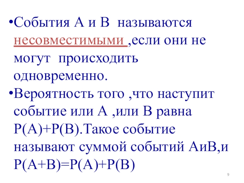 Слайд 9События А и В называются несовместимыми ,если они не могут происходить