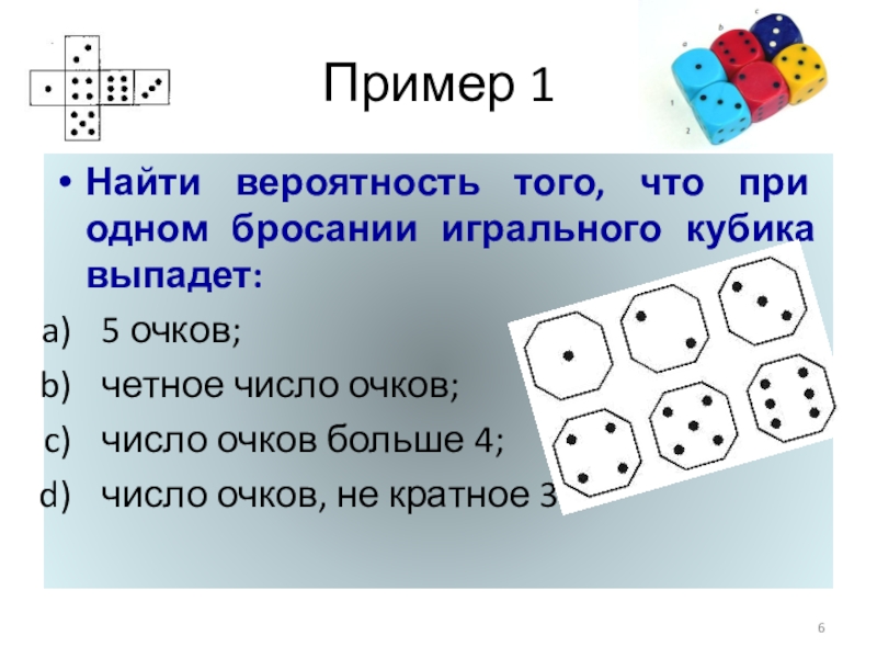 Пример 1Найти вероятность того, что при одном бросании игрального кубика выпадет:5 очков;четное число очков;число очков больше 4;число