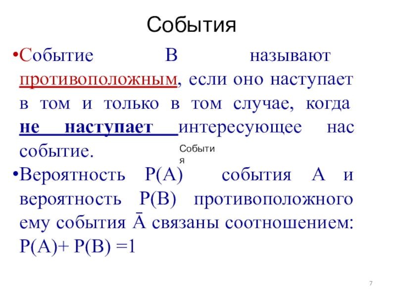 СобытияСобытияСобытие В называют противоположным, если оно наступает в том и только в том случае, когда  не
