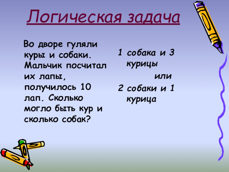 Во дворе гуляли куры и собаки. Мальчик посчитал их лапы, получилось 10 лап. Сколько могло быть кур и сколько собак?