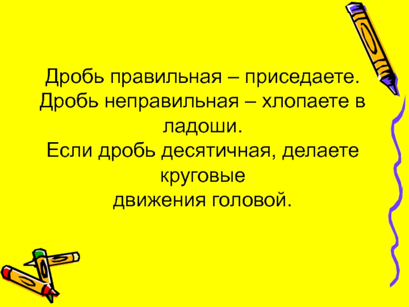 Дробь правильная – приседаете.Дробь неправильная – хлопаете в ладоши.Если дробь десятичная, делаете круговые движения головой.