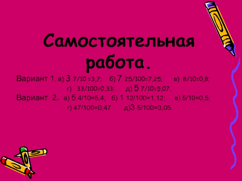 Самостоятельная работа.Вариант 1. а) 3 7/10 =3,7;  б) 7 25/100=7,25;   в) 8/10=0,8;г)  33/100=0,33;