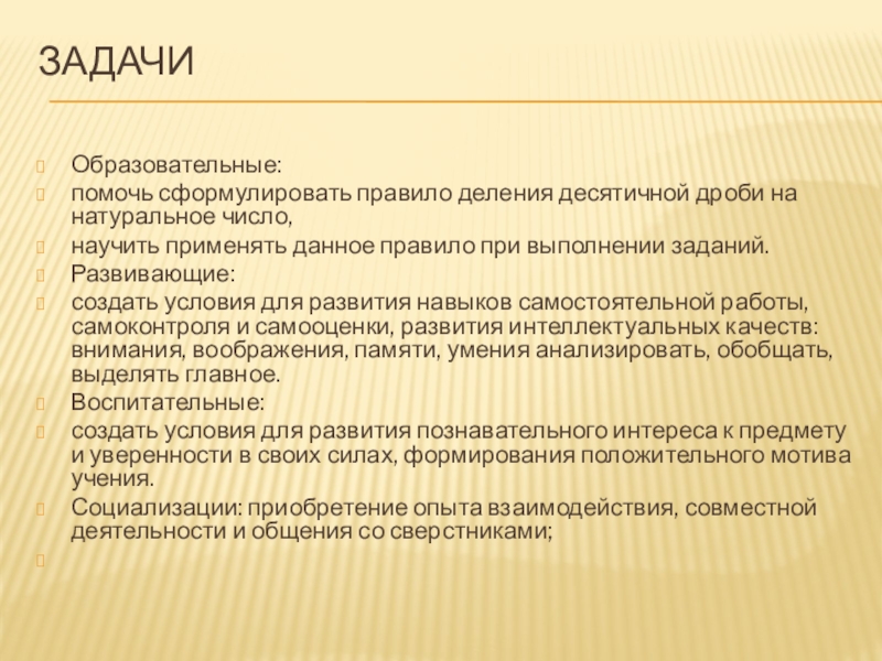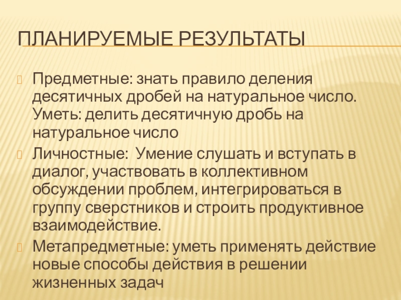 Предметные: знать правило деления десятичных дробей на натуральное число. Уметь: