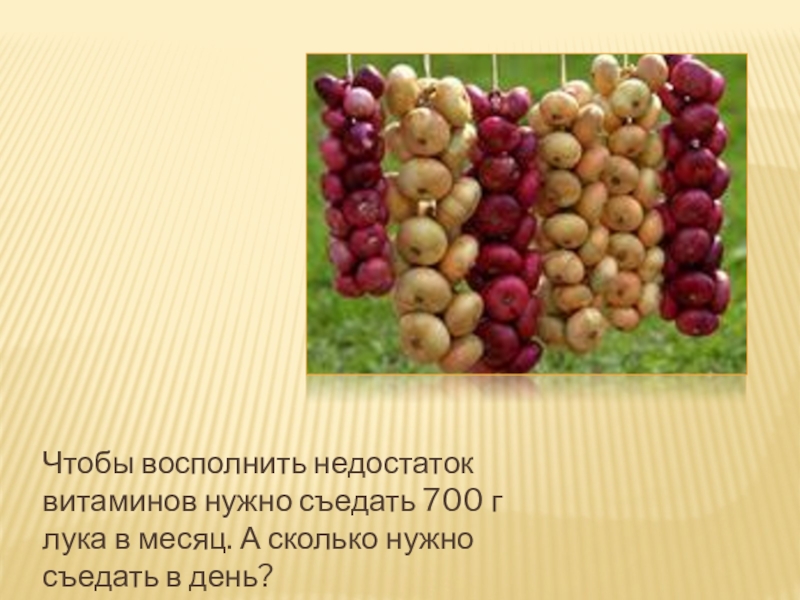 Слайд 18Чтобы восполнить недостаток витаминов нужно съедать 700 г лука в месяц.