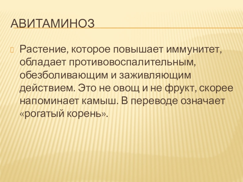 не овощ и не фрукт, скорее напоминает камыш. В переводе означает «рогатый корень».