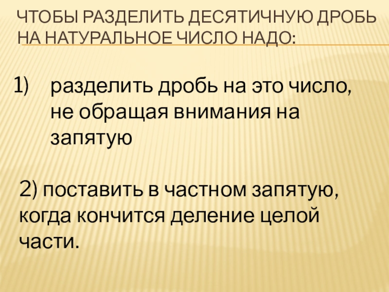 Слайд 19Чтобы разделить десятичную дробь на натуральное число надо:
