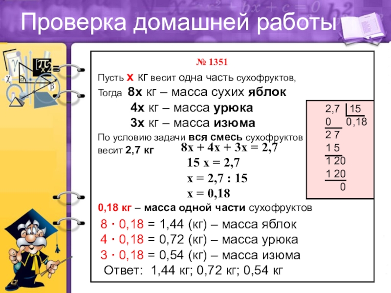 8 ∙ 0,18 = 1,44 (кг) – масса яблок