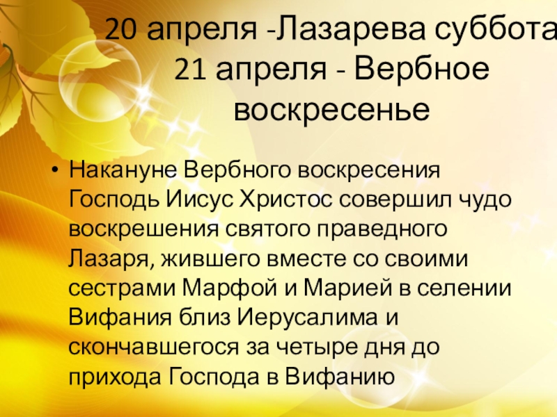 20 апреля -Лазарева суббота 21 апреля - Вербное воскресенье Накануне Вербного воскресения Господь Иисус Христос совершил чудо воскрешения