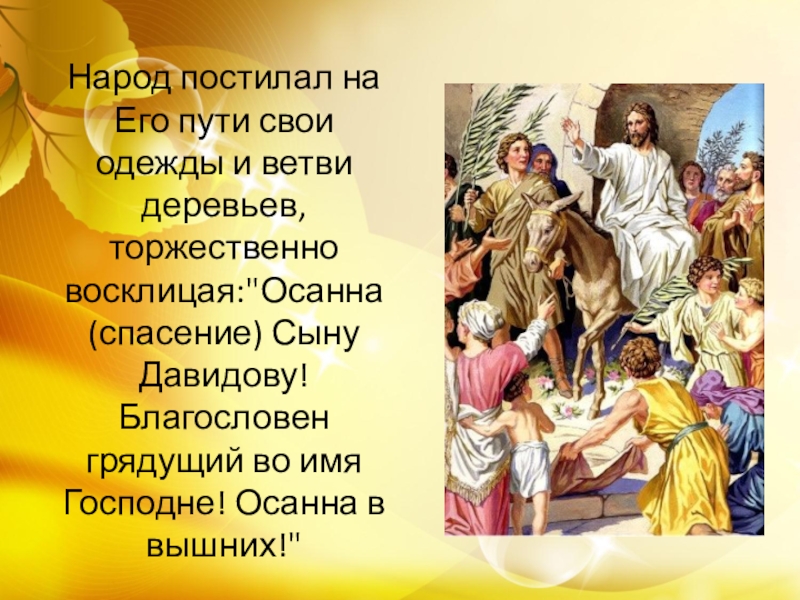 Слайд 10Народ постилал на Его пути свои одежды и ветви деревьев, торжественно