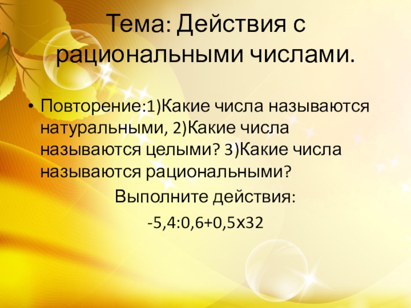 Тема: Действия с рациональными числами.Повторение:1)Какие числа называются натуральными, 2)Какие числа называются целыми? 3)Какие числа называются рациональными?Выполните действия:-5,4:0,6+0,5х32