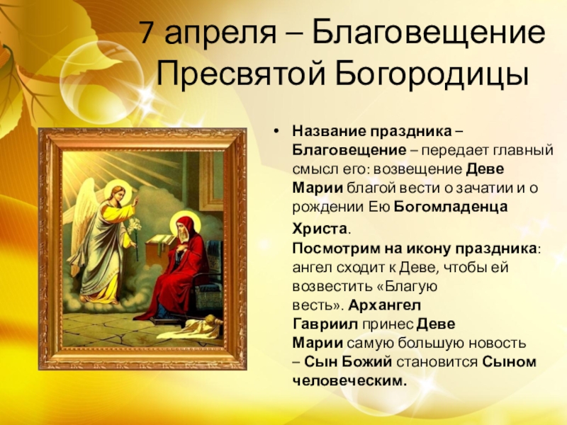 7 апреля – Благовещение Пресвятой БогородицыНазвание праздника – Благовещение – передает главный смысл его: возвещение Деве Марии благой вести о