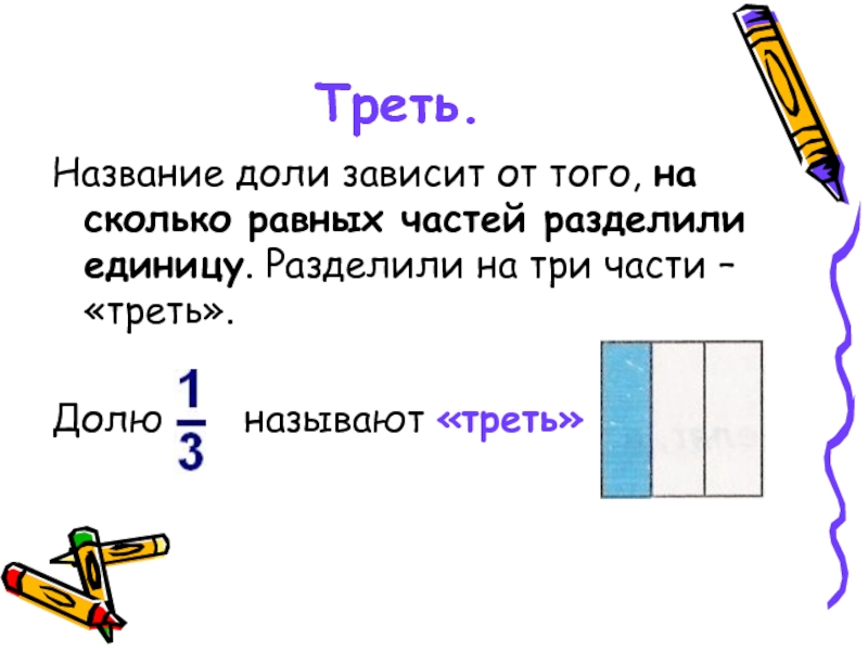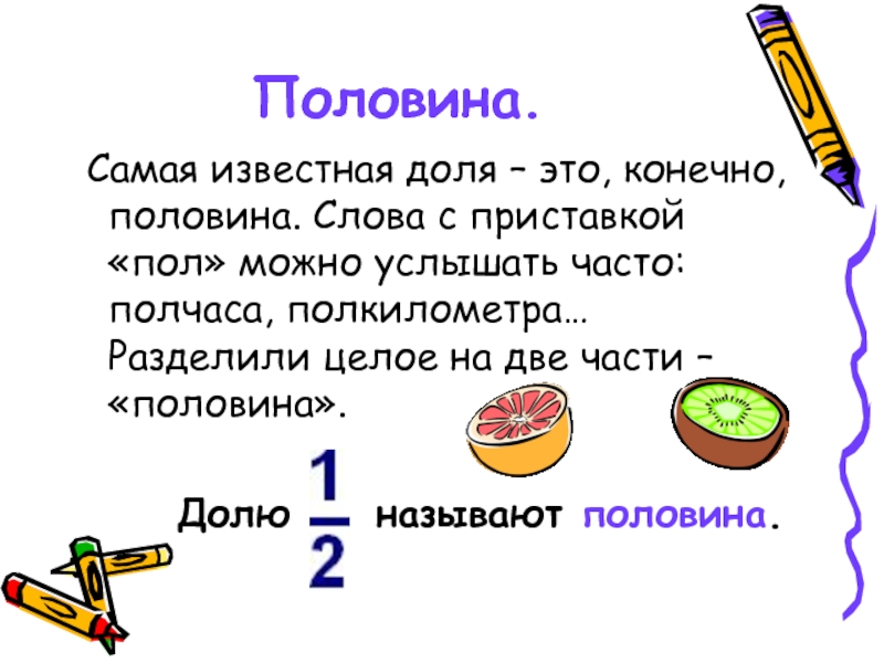 Познакомить с понятием доля, половина, треть, четверть, обыкновенная дробь,
