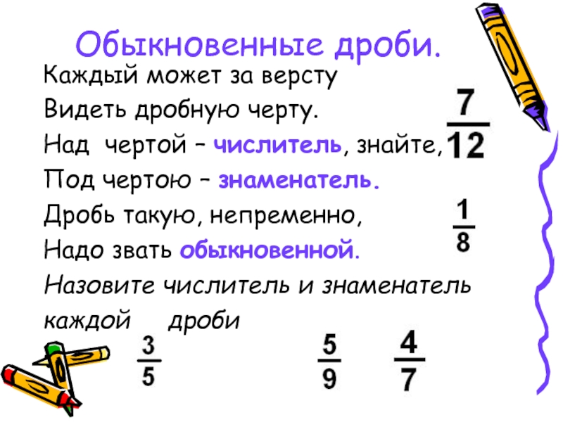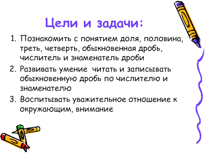 Развивать умение читать и записывать обыкновенную дробь по числителю и знаменателю