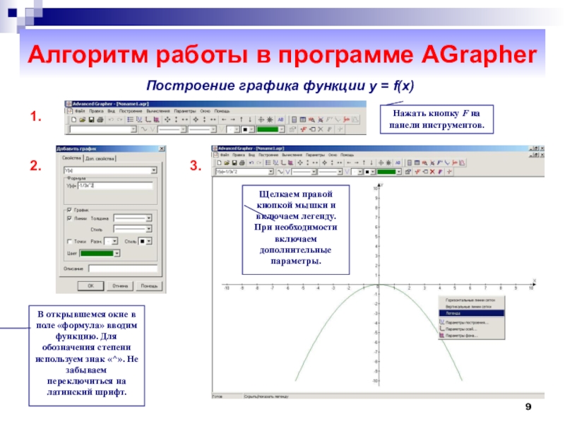 В открывшемся окне в поле «формула» вводим функцию. Для обозначения степени используем знак «^». Не забываем переключиться на латинский шрифт.