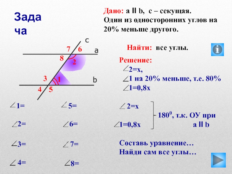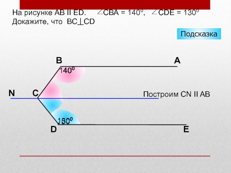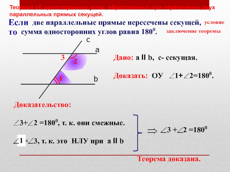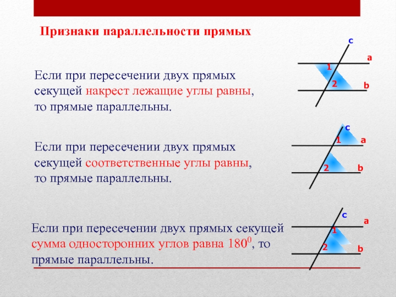 Если при пересечении двух прямых секущей сумма односторонних углов равна 1800, то прямые параллельны.