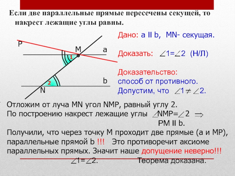 Получили, что через точку М проходит две прямые (а и МР), параллельные прямой b !!! Это противоречит аксиоме параллельных прямых. Значит наше допущение неверно!!!