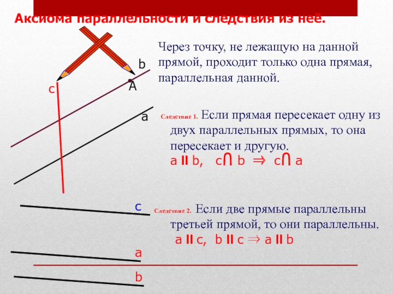 Следствие 2. Если две прямые параллельны третьей прямой, то они параллельны.