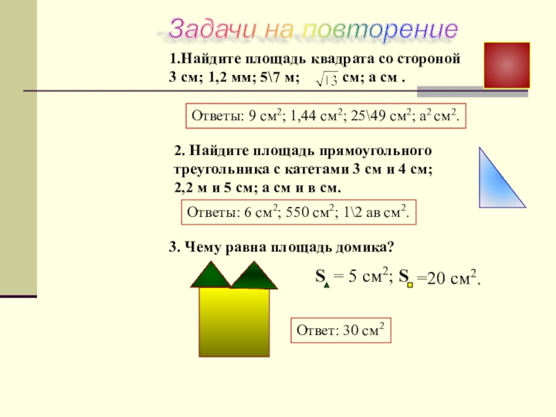 Ответы: 9 см2; 1,44 см2; 25\49 см2; а2 см2.