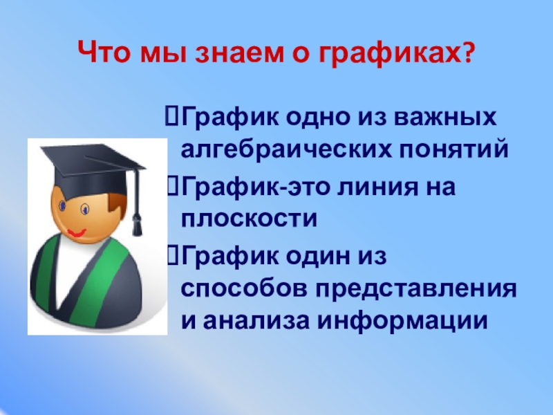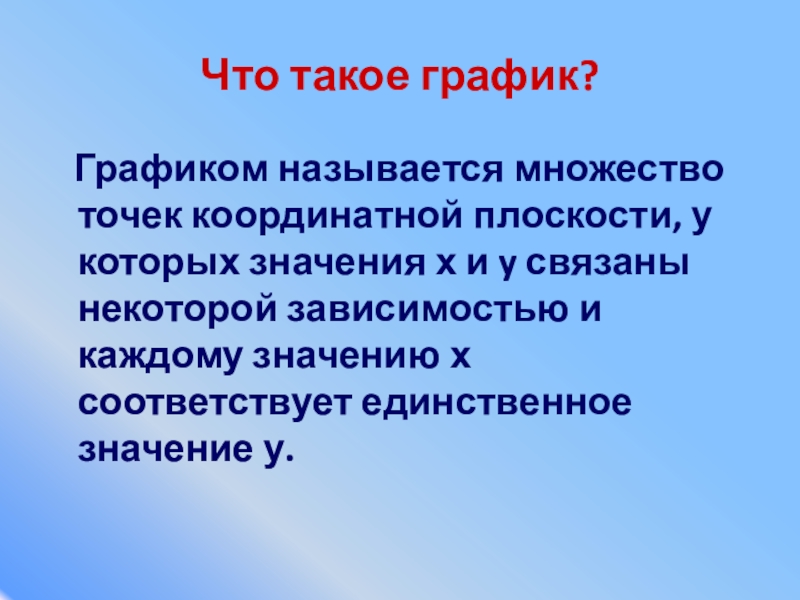 Графиком называется множество точек координатной плоскости, у которых значения х и y связаны некоторой зависимостью и каждому значению х соответствует единственное значение у.
