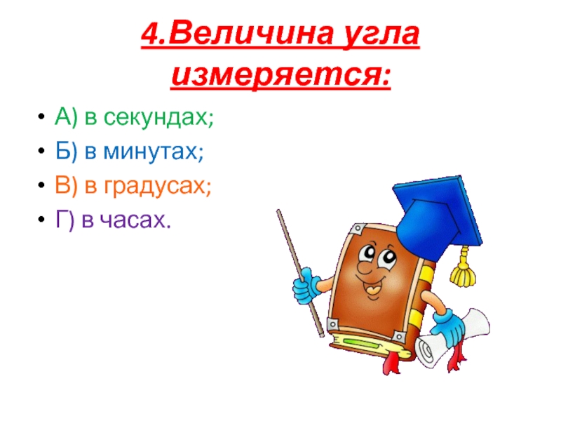 4.Величина угла измеряется:А) в секундах;Б) в минутах;В) в градусах;Г) в часах.