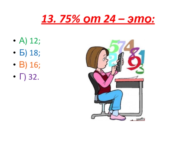 13. 75% от 24 – это:А) 12;Б) 18;В) 16;Г) 32.