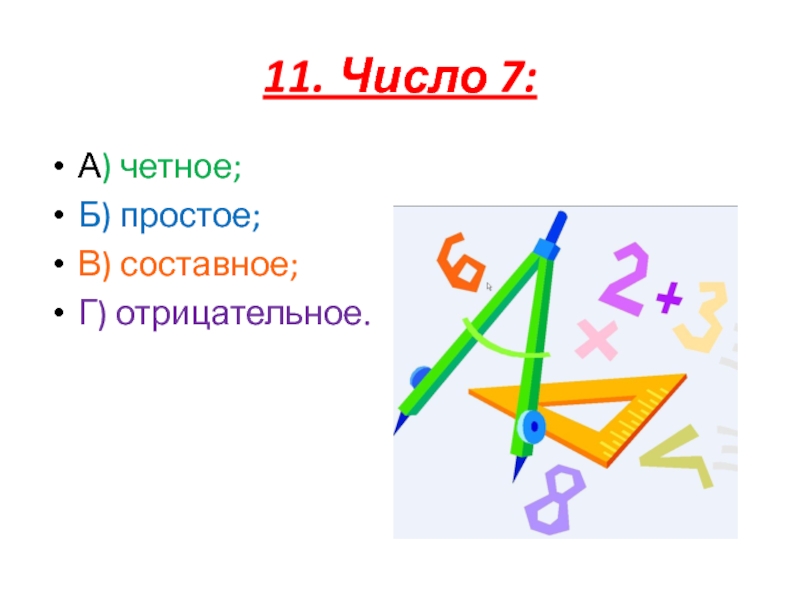 11. Число 7:А) четное;Б) простое;В) составное;Г) отрицательное.