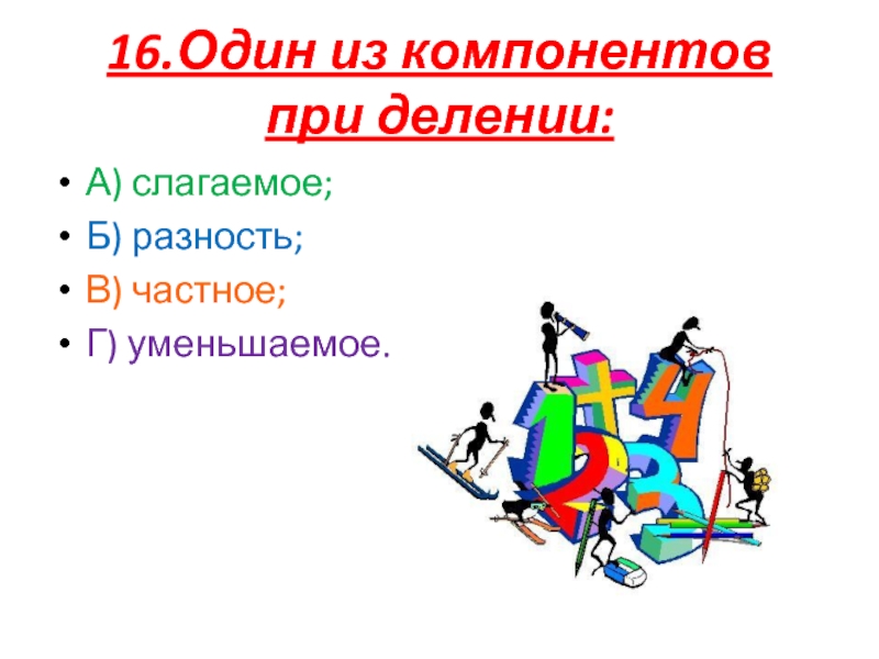 16.Один из компонентов при делении:А) слагаемое;Б) разность;В) частное;Г) уменьшаемое.