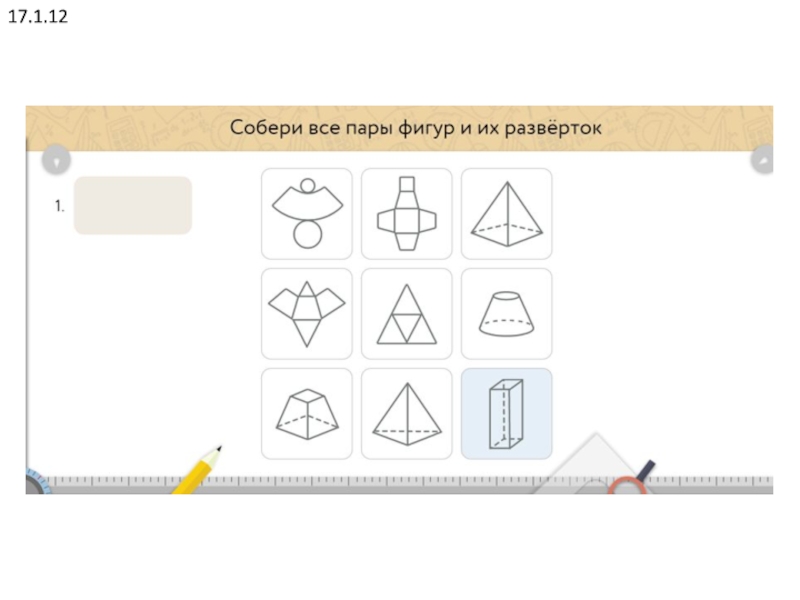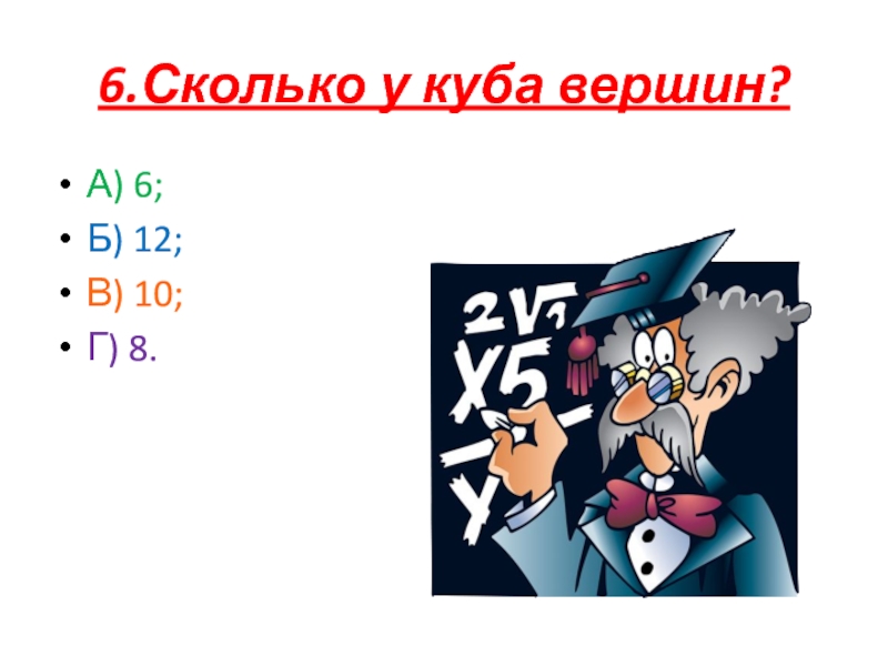 6.Сколько у куба вершин?А) 6;Б) 12;В) 10;Г) 8.