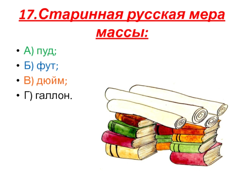 17.Старинная русская мера массы:А) пуд;Б) фут;В) дюйм;Г) галлон.