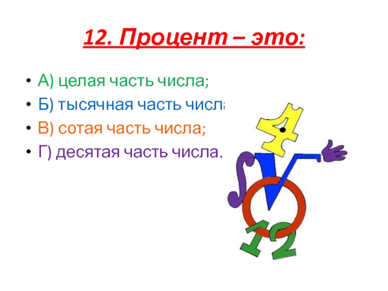 12. Процент – это:А) целая часть числа;Б) тысячная часть числа;В) сотая часть числа;Г) десятая часть числа.