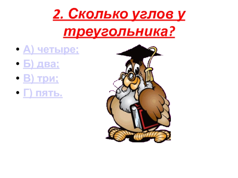2. Сколько углов у треугольника?А) четыре;Б) два;В) три;Г) пять.