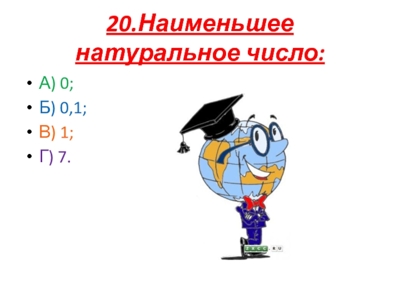 20.Наименьшее натуральное число:А) 0;Б) 0,1;В) 1;Г) 7.