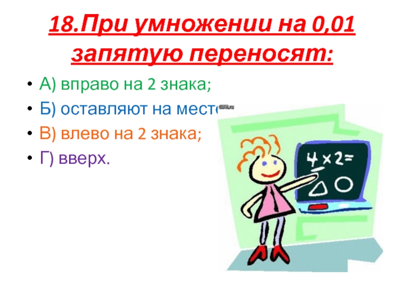 18.При умножении на 0,01 запятую переносят:А) вправо на 2 знака;Б) оставляют на месте;В) влево на 2 знака;Г)