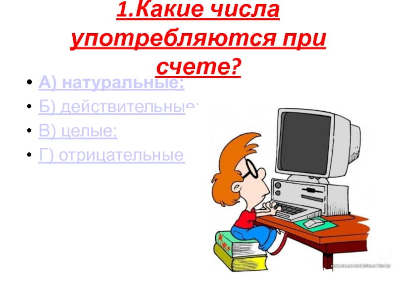 1.Какие числа употребляются при счете?А) натуральные;Б) действительные;В) целые;Г) отрицательные.