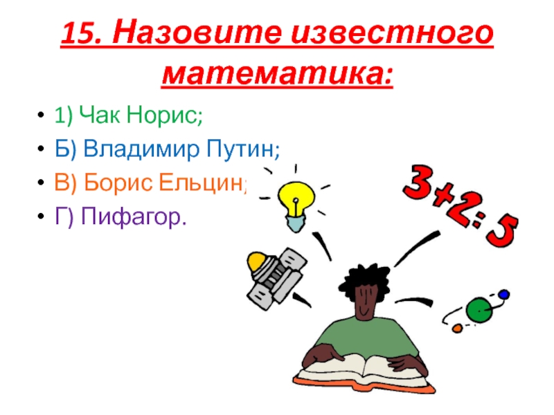 15. Назовите известного математика:1) Чак Норис;Б) Владимир Путин;В) Борис Ельцин;Г) Пифагор.