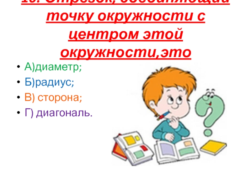 10. Отрезок, соединяющий точку окружности с центром этой окружности,этоА)диаметр;Б)радиус;В) сторона;Г) диагональ.