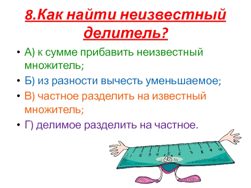 8.Как найти неизвестный делитель?А) к сумме прибавить неизвестный множитель;Б) из разности вычесть уменьшаемое;В) частное разделить на известный