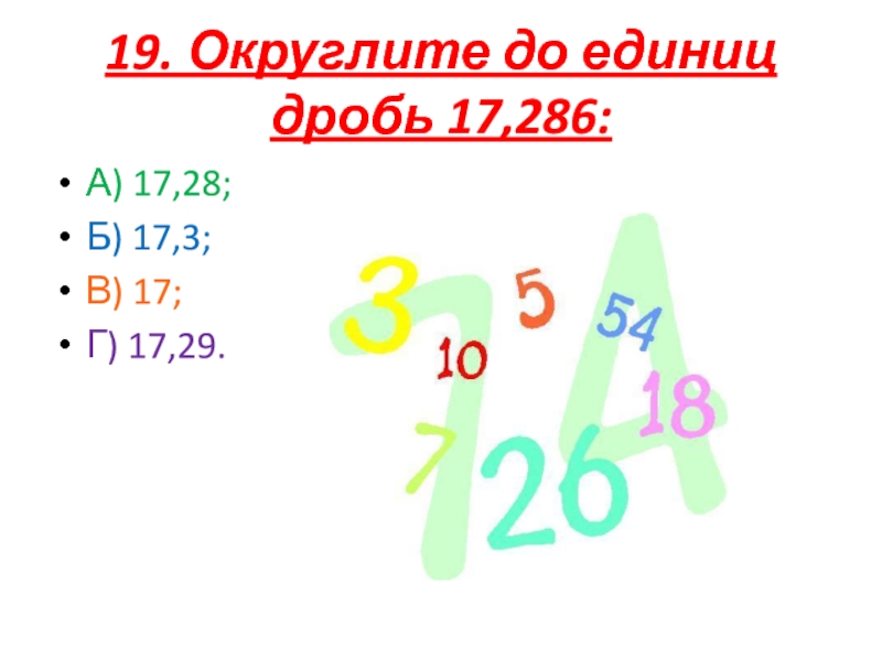 19. Округлите до единиц дробь 17,286:А) 17,28;Б) 17,3;В) 17;Г) 17,29.